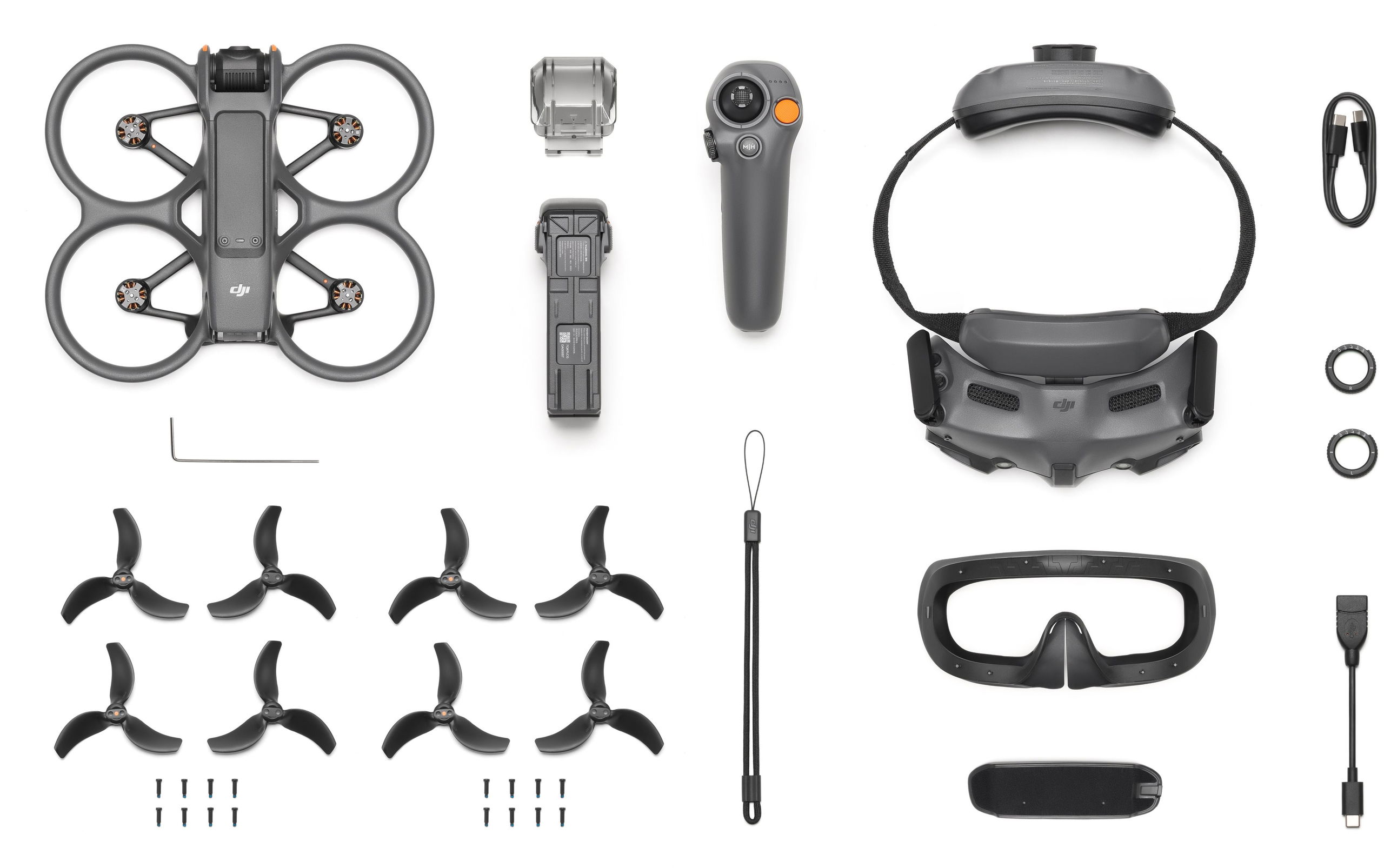 Drone – 4K camera, transmission range of 10000 m, operation time of 23 min, maximum speed of 97 km/h, 46GB internal memory 256GB, weight: 410g, package includes remote control, bag, drone battery, controller battery, USB-C cable, charging station, FPV glasses, screwdriver, strap, corrective lenses and propeller