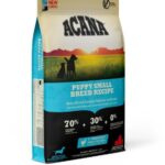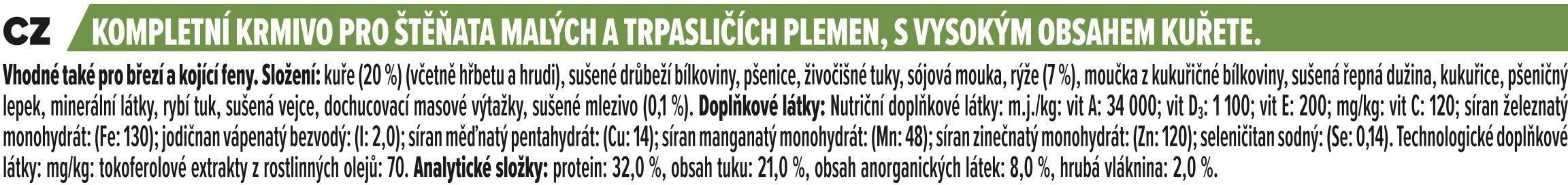 Dry puppy kibble for small breeds; animal protein 22.2%; fat 4.5%.